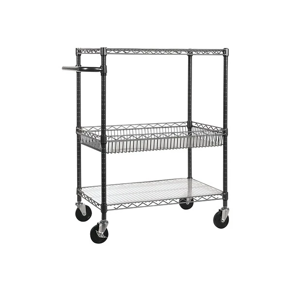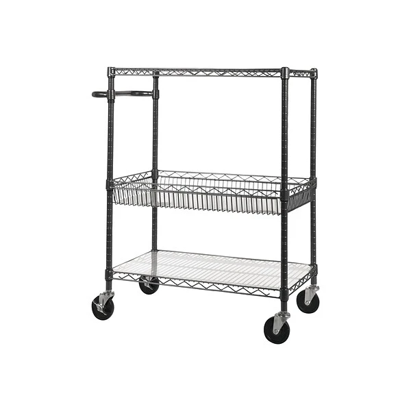 Organize and simplify the transportation of files with this Alera three-tier wire cart. With a capacity of up to 500 pounds, storing and moving heavy loads of paperwork and files is simple. This cart has a durable wire construction and features a pull handle for easy mobility. The three shelves on this Alera black wire cart allow for easy access to contents and provide maximum storage.