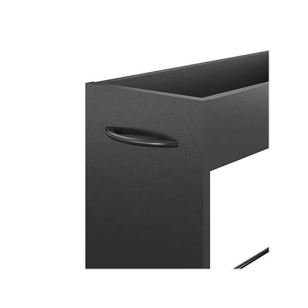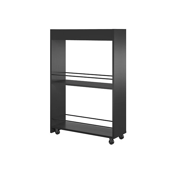 Get compact storage wherever you need it with the Ameriwood Trestle laundry cart. Black laminate finish will easily match your existing decor. The two lower shelves feature durable metal rods to keep all your essentials in place. Organize detergent, fabric softener and dryer sheets, and then tuck away when not in use. The casters make it easy to place the cart wherever you need it. The compact design is perfect for storing the cart next to your washer or dryer to save space. The top shelf is great for laundry essentials like stain fighters and scrubbing brushes. This multiuse cart can also be used for a convenient spice rack that can be stored next to your refrigerator or an office cart to store away extra office supplies. The storage possibilities are endless. The laundry cart ships flat to your door and requires assembly upon opening. Two adults are recommended to assemble.