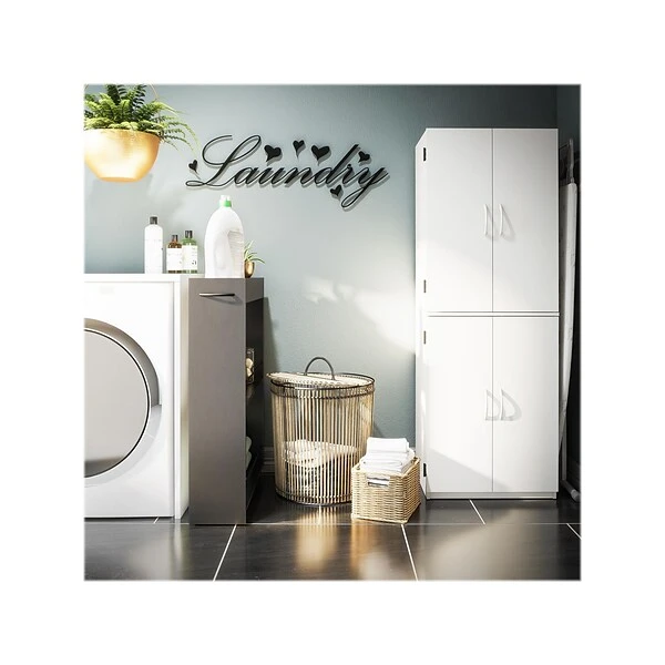 - Three shelves can add extra storage for laundry essentials, extra office supplies, or wine and liquor bottles
