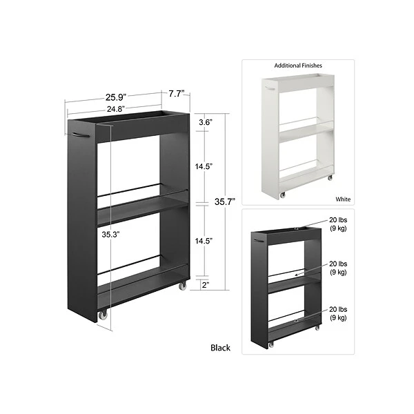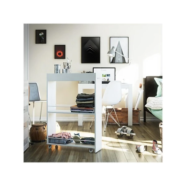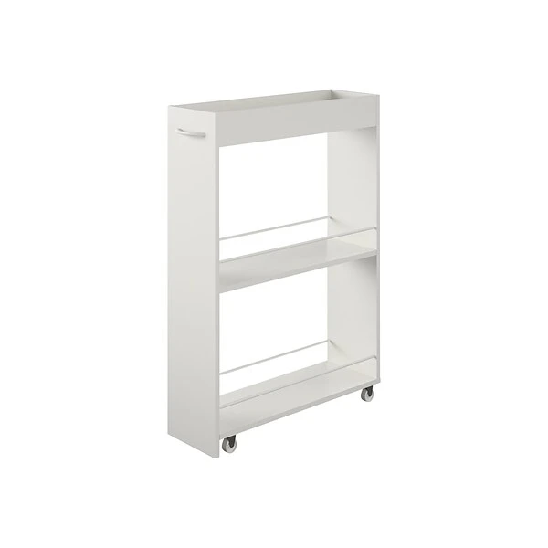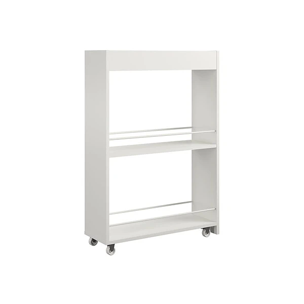 Get compact storage wherever you need it with the Ameriwood Trestle laundry cart. White laminate finish will easily match your existing decor. The two lower shelves feature durable metal rods to keep all your essentials in place. Organize detergent, fabric softener and dryer sheets, and then tuck away when not in use. The casters make it easy to place the cart wherever you need it. The compact design is perfect for storing the cart next to your washer or dryer to save space. The top shelf is great for laundry essentials like stain fighters and scrubbing brushes. This multiuse cart can also be used for a convenient spice rack that can be stored next to your refrigerator or an office cart to store away extra office supplies. The storage possibilities are endless. The laundry cart ships flat to your door and requires assembly upon opening. Two adults are recommended to assemble.