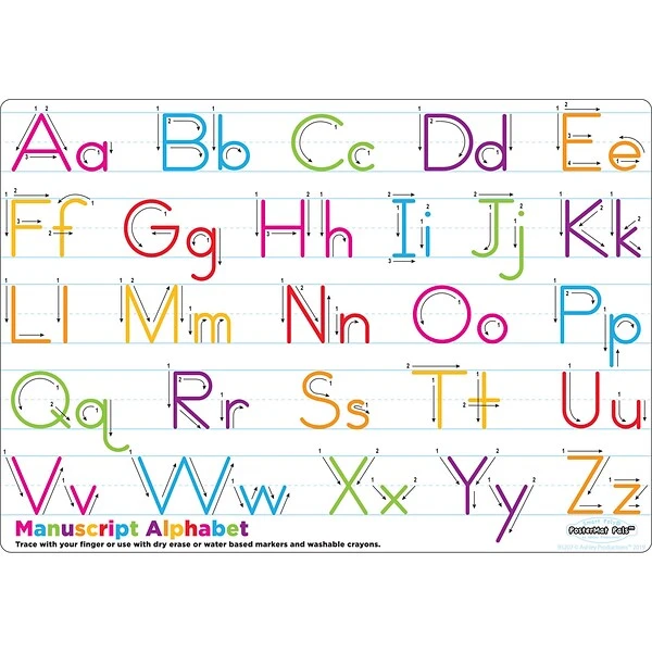 It’s a poster, it’s a placemat, it’s both! Smart Poly® material has been designed for the classroom and home. The material is strong, durable, water resistant, and does not need lamination. Heavy duty surface for fun and colorful learnings. Write-on/wipe-off surface for use with dry erase or water based markers and washable crayons. Measures 12″ x 17.25″. Practice tracing the alphabet.
