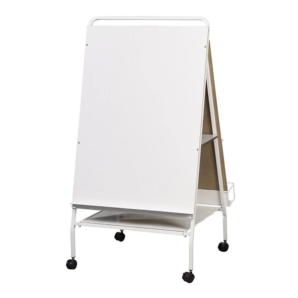 Double-Sided BoardThe Best-Rite baby folding Wheasel has two boards with one on each side of the easel. This allows you to add more notes or to display the same item on both sides for customer traffic that enters from multiple areas of a building. The double-sided board is small enough to be used in classrooms and has two dry-erase boards that can be used with traditional dry-erase markers and erasers. Holds Books in PlaceThe Best-Rite baby folding Wheasel has a wire bookrack that holds books in place, so you can read stories to your class without having to hold a book in your hands. In addition, your Wheasel can be rolled from place to place on its casters for easy movement.Stylish DesignThis folding Wheasel has a design that suits an office or classroom. It has a white powder-coated steel frame that supports the weight of the markerboards without an issue. Additionally, it also supports the add-on accessory tray that is used on each side of the easel.