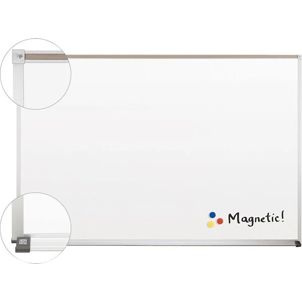 This steel whiteboard is crafted for exceptional contrast with colorful dry erase markers. The reduced board reflection is easier on the eyes, and the whiteboard is permanently laminated to provide superior stability and durability. The anodized aluminum frame is a lovely addition and fits in perfectly with most other classroom or office accessories.