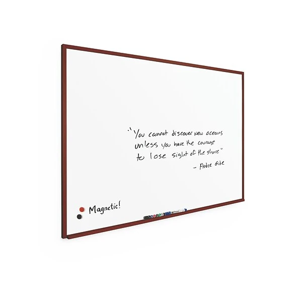 Plan strategies, take notes and track information on this whiteboard. The magnetic surface lets you use magnetic clips, die-cut symbols, and other accessories, and the full-length tray provides space for erasers and plenty of dry-erase markers. This MooreCo porcelain and steel whiteboard has a mahogany trim for a classic look.