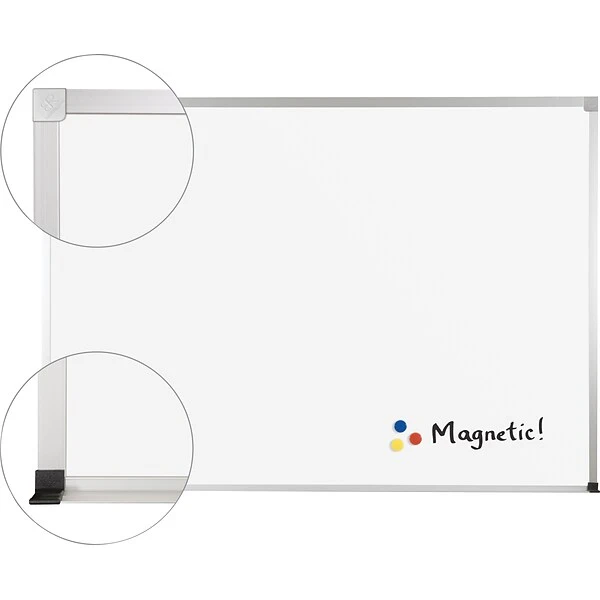 Magnetic porcelain steel whiteboards are engineered for superior color contrast with dry erase markers. Standard whiteboard gloss dry erase surface provides superior writability and erasability with no ghosting. Reduced surface light distortion enhances visibility to provide optimum eye comfort.