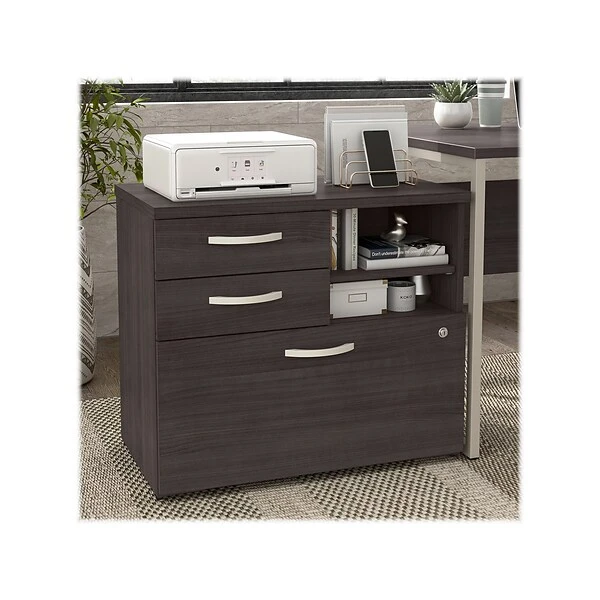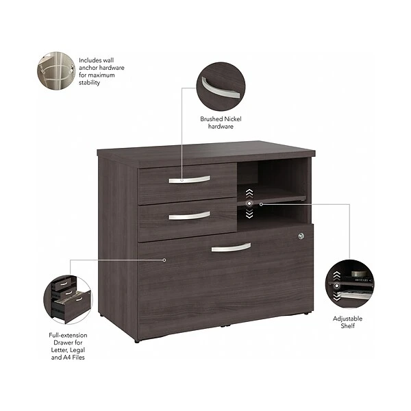 The Bush Business Furniture Hybrid office storage cabinet with drawers and shelves offers a stylish, long-lasting workplace organization solution for the modern professional. Keep important documents, office supplies, work in progress, and equipment in order, so you can access the materials you need quickly and easily. A file drawer opens on smooth full-extension ball bearing slides for an effortless reach to letter-, legal-, and A4-size paperwork and can be locked to protect sensitive information. Two box drawers organize writing utensils, notepads, and other supplies, while the open shelves are ideal for frequently used items. The file storage cabinet’s stable design and included wall attachment hardware make it a safe choice for use in virtually any home or professional office environment. Find the perfect look for your space with five contemporary finish options: black walnut, modern hickory, platinum gray, storm gray, and white. This lateral file cabinet with shelves has been meticulously tested to meet or exceed ANSI/BIFMA quality standards for safety, durability, and performance and is backed by the Bush Business Furniture 10-year manufacturer warranty. See the full Bush Business Furniture Hybrid collection for coordinating items to enhance your workspace as needed, including computer desks, bookcases, and storage cabinets (coordinating items sold separately). American-made with US and imported parts.