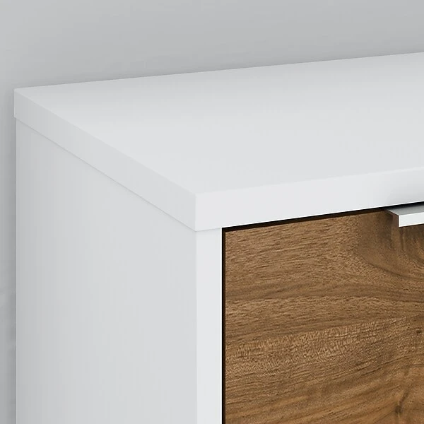 - Made of thermally fused laminate over composite wood in a fresh walnut/white finish