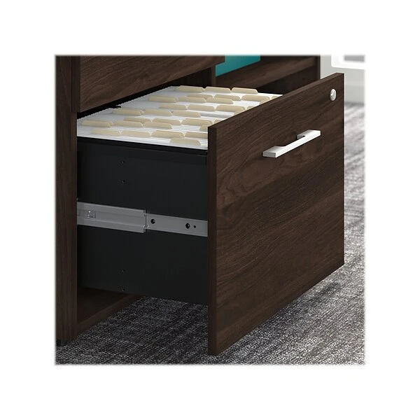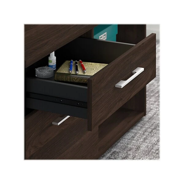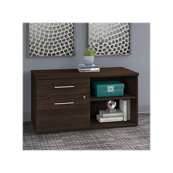 The Bush Business Furniture Office 500 low storage cabinet with drawers and shelves features a practical design that’s perfect for the modern workplace. The Bush Business Furniture Office 500 low storage cabinet with drawers and shelves presents a practical solution for keeping work materials organized in any professional space. On the left side of the cabinet a file drawer with smooth full-extension ball bearing slides holds legal-, letter-, and A4-size paperwork, while a box drawer stores miscellaneous office supplies. A single lock secures both drawers to protect sensitive documents and personal items. The right side features one fixed shelf and one adjustable shelf to accommodate books, binders, and reference materials of various sizes. The surface of the low storage credenza makes a great printer stand or laptop charging station and can also be used to display decorations. This office cabinet is tested to meet ANSI/BIFMA standards for safety and performance and is backed by a 10-year warranty. American-made with US and imported parts.