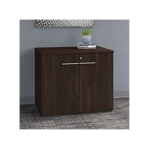 With its sophisticated style and practical design, the Bush Business Furniture Office 500 storage cabinet with doors is a perfect fit for modern workspaces. This storage cabinet offers an efficient and secure way to organize materials in any workspace. With one fixed shelf and one adjustable shelf that support up to 50 lbs. each, this two-door cabinet is a perfect solution for storing office supplies and reference materials of various sizes. Its doors feature smooth Euro-style hinges for easy access to contents and can be locked to protect valuable items. The back panel includes a built-in wire management grommet to accommodate electronic devices, such as a laptop, router, and modem set. A single accent cabinet accepts the coordinating 36″W bookcase hutch while a set of two can accept a 72″W desk hutch (hutches sold separately). This locking storage cabinet is tested to meet ANSI/BIFMA standards for safety and performance and is backed by a 10-year warranty. American-made with US and imported parts.