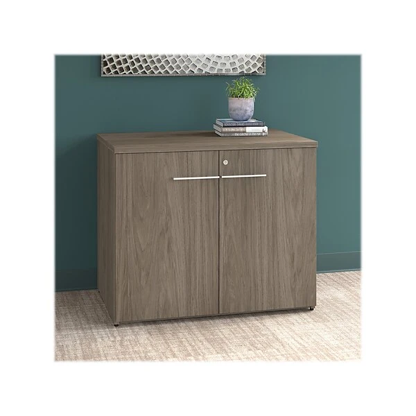 With its sophisticated style and practical design, the Bush Business Furniture Office 500 storage cabinet with doors is a perfect fit for modern workspaces. This storage cabinet offers an efficient and secure way to organize materials in any workspace. With one fixed shelf and one adjustable shelf that support up to 50 lbs. each, this two-door cabinet is a perfect solution for storing office supplies and reference materials of various sizes. Doors feature smooth Euro-style hinges for easy access to contents and can be locked to protect valuable items. The back panel includes a built-in wire management grommet to accommodate electronic devices like a laptop or router and modem set. A single accent cabinet accepts the coordinating 36″W bookcase hutch while a set of two can accept a 72″W desk hutch (hutches sold separately). This locking storage cabinet is tested to meet ANSI/BIFMA standards for safety and performance and is backed by a 10-year warranty. American-made with US and imported parts.