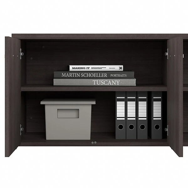 The Bush Business Furniture Studio A low storage cabinet with doors and shelves combines a fresh contemporary appearance with the commercial-quality construction needed to withstand years of everyday use. The open and closed compartments each include one fixed shelf and one adjustable shelf to accommodate everything from books and reference materials to decorations. Each shelf supports up to 50 lbs., so storing and displaying larger items is never an issue. The surface of the storage credenza can be used as a practical place to keep a small printer and other equipment or to give your workspace a personal touch with plants, pictures, and more. This office credenza storage cabinet with shelves has been meticulously tested to meet or exceed the ANSI/BIFMA quality standards for safety, durability, and performance and is backed by a 10-year manufacturer limited warranty. American-made with US and imported parts.