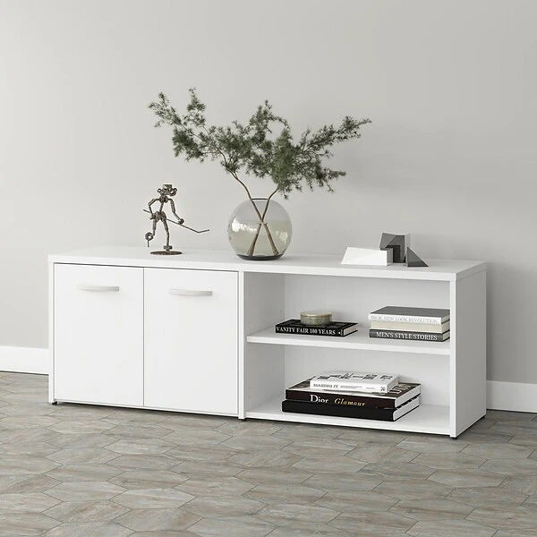 The Bush Business Furniture Studio A low storage cabinet with doors and shelves combines a fresh contemporary appearance with the commercial-quality construction needed to withstand years of everyday use. The open and closed compartments each include one fixed shelf and one adjustable shelf to accommodate everything from books and reference materials to decorations. Each shelf supports up to 50 lbs., so storing and displaying larger items is never an issue. The surface of the storage credenza can be used as a practical place to keep a small printer and other equipment or to give your workspace a personal touch with plants, pictures, and more. This office credenza storage cabinet with shelves has been meticulously tested to meet or exceed the ANSI/BIFMA quality standards for safety, durability, and performance and is backed by a 10-year manufacturer limited warranty. American-made with US and imported parts.