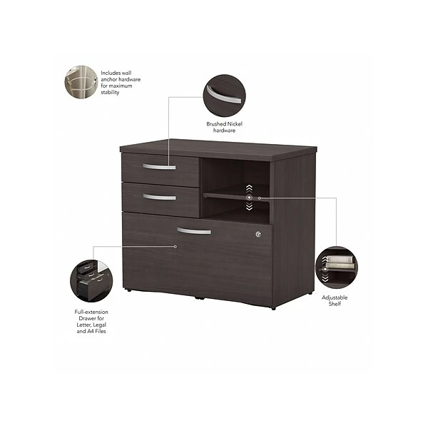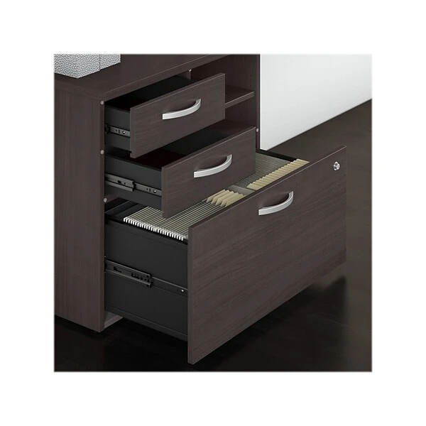 The Bush Business Furniture Studio C office storage cabinet with drawers and shelves offers a stylish, long-lasting workplace organization solution for today’s professionals. Keep important documents, office supplies, work in progress, and equipment in order so you can access the materials you need quickly and easily. A file drawer opens on smooth full-extension ball bearing slides for an effortless reach to letter-, legal-, and A4-size paperwork and can be locked to protect sensitive information. Two box drawers organize writing utensils, notepads, and other supplies, while the open shelves are perfect for frequently used items. This lateral file cabinet with shelves has been meticulously tested to meet or exceed ANSI/BIFMA standards for safety, durability, and performance and is backed by the Bush Business Furniture 10-year manufacturer’s warranty. American-made with US and imported parts.