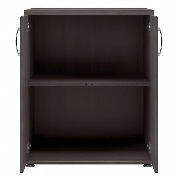 The Bush Business Furniture Universal floor storage cabinet with doors and shelves features a commercial-quality design and contemporary styling that suits virtually any home or professional environment. Organize your office, break room, garage, laundry room, or any other work or living space with an accent cabinet that’s built to last and boasts plenty of practical storage capacity. Cabinet doors with smooth Euro-style hinges open to reveal one fixed shelf and one adjustable shelf that accommodate office supplies, books, tools, and household items of various sizes. Each shelf supports up to 50 lbs., so storing larger materials is no problem. The floor cabinet’s base includes adjustable levelers to compensate for uneven surfaces. This two-door storage cabinet has been tested to meet ANSI/BIFMA quality standards for safety and performance and is backed by a 10-year manufacturer warranty.