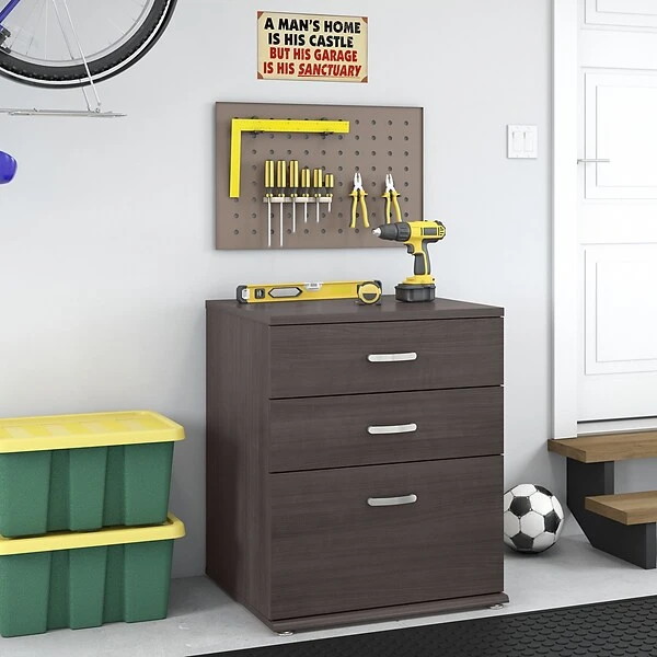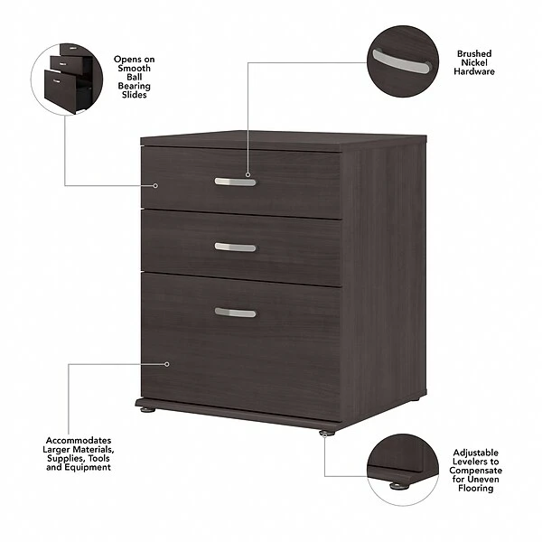 The Bush Business Furniture Universal floor storage cabinet with drawers features a commercial-quality design and contemporary styling that suits virtually any home or professional environment. Organize your office, break room, garage, laundry room, or any other work or living space with an accent cabinet that’s built to last and boasts plenty of practical storage capacity. Drawers can hold up to 30 lbs. each and open on smooth full-extension ball bearing slides for an effortless reach to office supplies, tools, household items, and more. The spacious bottom drawer easily accommodates larger materials and equipment. The floor cabinet’s base includes adjustable levelers to compensate for uneven surfaces. This three-drawer cabinet has been tested to meet ANSI/BIFMA standards for safety and performance and is backed by a 10-year warranty. See the full collection for coordinating items available.