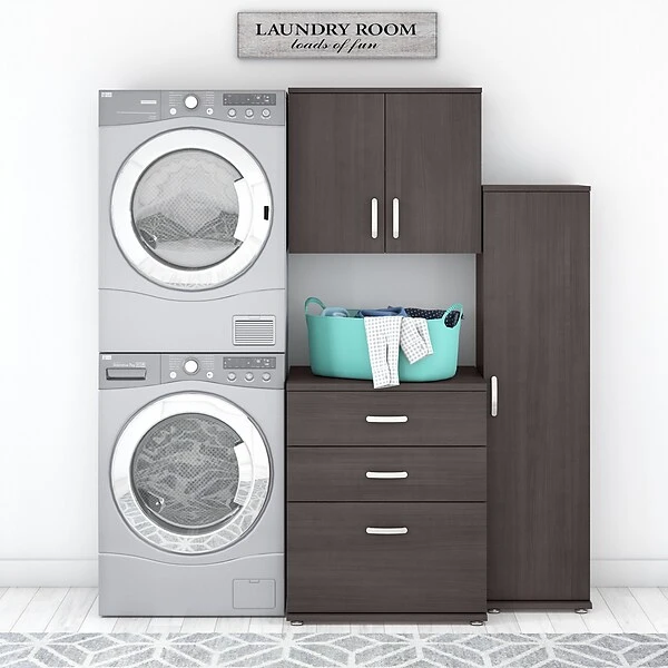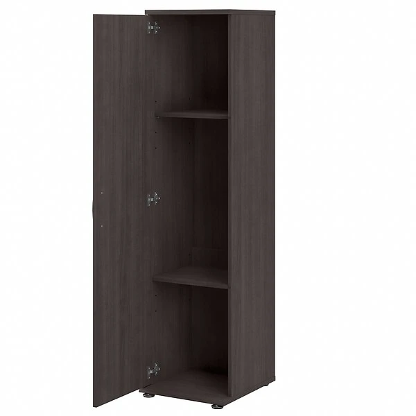 The Bush Business Furniture Universal 44″W three-piece modular storage set with floor and wall cabinets features commercial-quality designs and contemporary styling that suits virtually any home or professional environment. Organize your office, break room, garage, laundry room, or another work or living space with storage furniture that’s built to last and offers plenty of room for supplies, materials, and equipment. The tall narrow storage cabinet contains one fixed shelf and two adjustable shelves to accommodate items of various sizes. A wall-mounted cabinet also features one fixed and one adjustable shelf for flexible, space-saving storage. Additional office supplies, tools, and household items can be stashed inside the three-drawer cabinet. This durable floor and wall storage cabinet set has been tested to meet ANSI/BIFMA standards for safety and performance and is backed by a 10-year warranty.