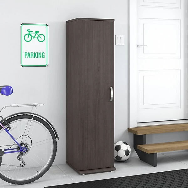 The Bush Business Furniture Universal tall narrow storage cabinet with door and shelves features a commercial-quality design and contemporary styling that suits virtually any home or professional environment. Organize your office, break room, garage, laundry room, or any other work or living space with a tall skinny cabinet that’s built to last and boasts plenty of storage capacity. The door opens to reveal one fixed shelf and two adjustable shelves for flexible storage of office supplies, tools, household items, and more. Each shelf supports up to 35 lbs., so storing larger materials and equipment is no problem. The floor cabinet’s base has adjustable levelers to compensate for uneven surfaces, and wall attachment hardware is included for maximum stability. This tall narrow cabinet has been tested to meet ANSI/BIFMA standards for safety and performance and is backed by a 10-year warranty.
