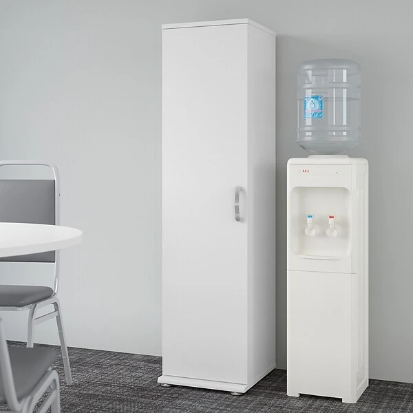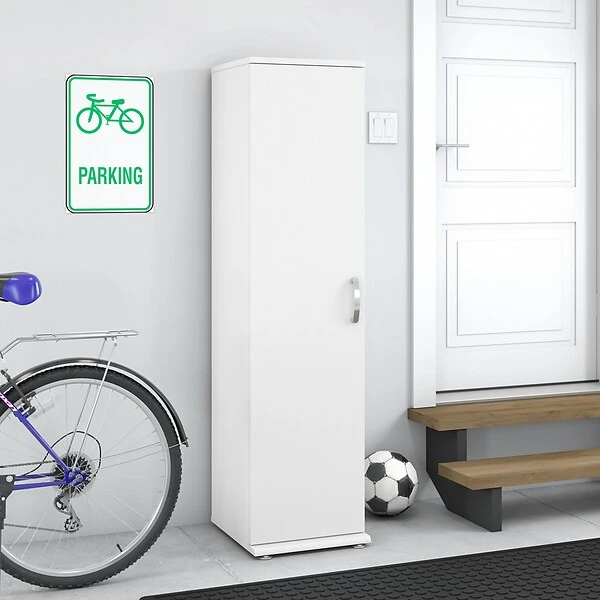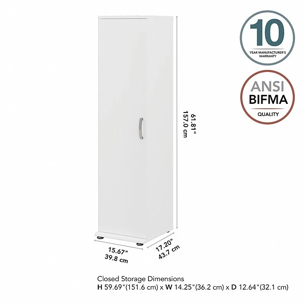 The Bush Business Furniture Universal tall narrow storage cabinet with door and shelves features a commercial-quality design and contemporary styling that suits virtually any home or professional environment. Organize your office, break room, garage, laundry room, or any other work or living space with a tall skinny cabinet that’s built to last and boasts plenty of storage capacity. The door opens to reveal one fixed shelf and two adjustable shelves for flexible storage of office supplies, tools, household items, and more. Each shelf supports up to 35 lbs., so storing larger materials and equipment is no problem. The floor cabinet’s base has adjustable levelers to compensate for uneven surfaces, and wall attachment hardware is included for maximum stability. This tall narrow cabinet has been tested to meet ANSI/BIFMA standards for safety and performance and is backed by a 10-year warranty.