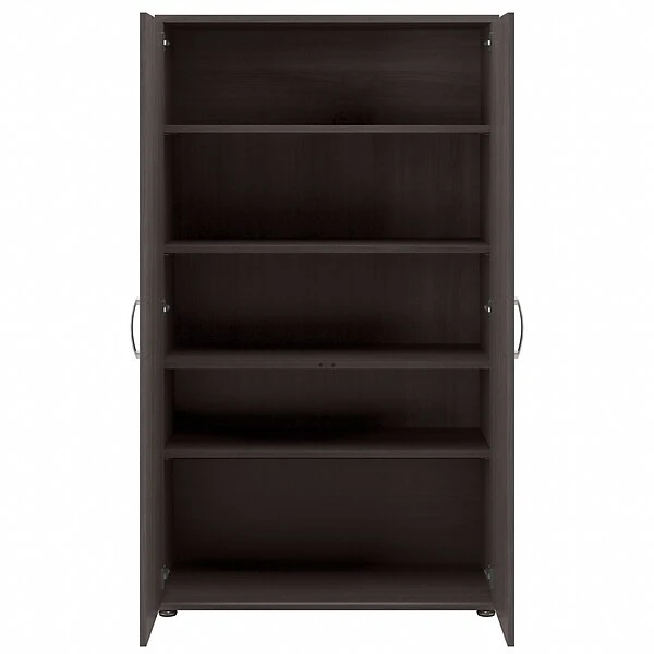 The Bush Business Furniture Universal tall storage cabinet with doors and shelves features a commercial-quality design and contemporary styling that suits virtually any home or professional environment. Organize your office, break room, garage, laundry room, or any other work or living space with a tall accent cabinet that’s built to last and boasts plenty of storage capacity. Cabinet doors open to reveal two fixed shelves and three adjustable shelves that accommodate office supplies, books, tools, and household items of various sizes. Each shelf supports up to 50 lbs., so storing larger materials is no problem. The floor cabinet’s base has adjustable levelers to compensate for uneven surfaces, and wall attachment hardware is included for maximum stability. This tall cabinet has been tested to meet ANSI/BIFMA quality standards for safety and performance and is backed by a 10-year warranty.