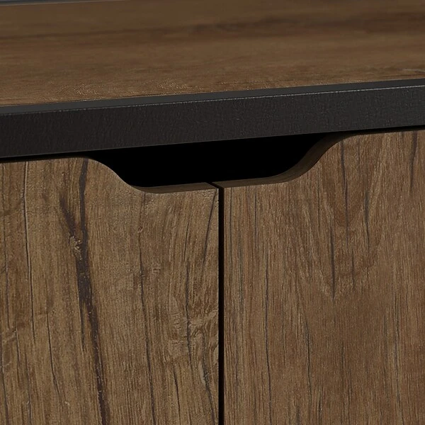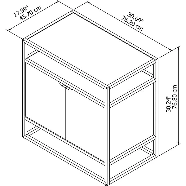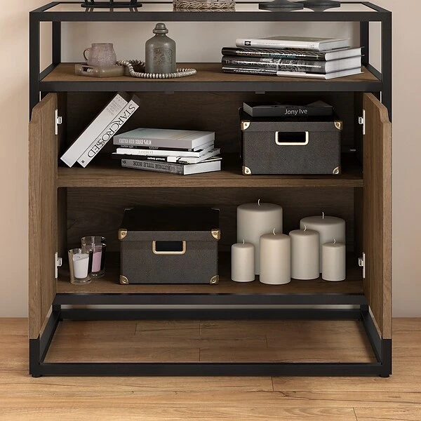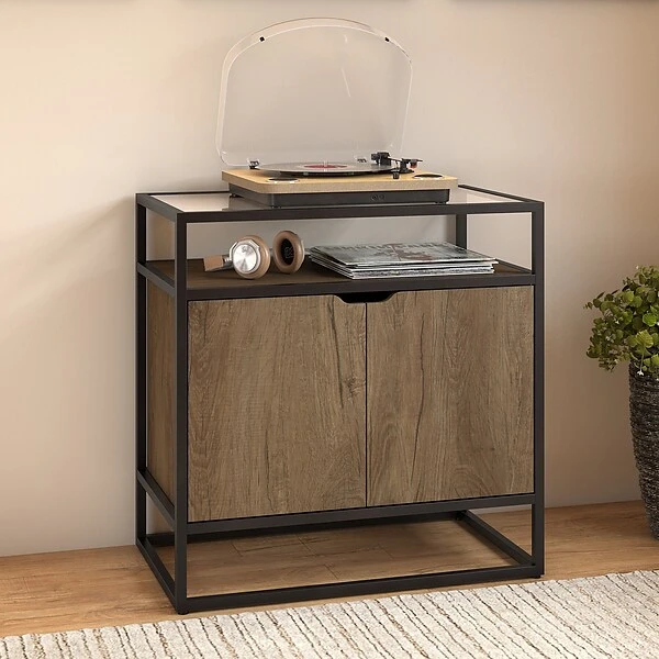 The Bush Furniture Anthropology Small Storage Cabinet with Doors provides a versatile home organization solution with an adaptable industrial modern design. A durable metal frame supports the rustic 2 door cabinet while a raised glass surface adds room for display and allows the top to function as a record player stand. The cabinet features an adjustable shelf for flexible storage and Euro style hinges that allow the doors to open and close smoothly. The glass top supports up to 25 pounds and includes a safety film. A 5 inch space beneath the glass surface allows the top of the cabinet to be used for storage and display of books, magazines, records and more. This home organizer is tested to meet ANSI/SOHO standards for safety and performance and is backed by a 1 year warranty. See the full line of Anthropology products for more urban industrial style home furnishings.