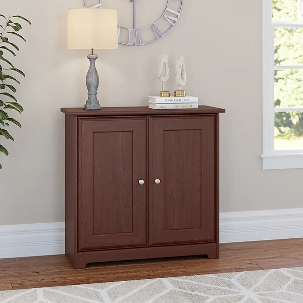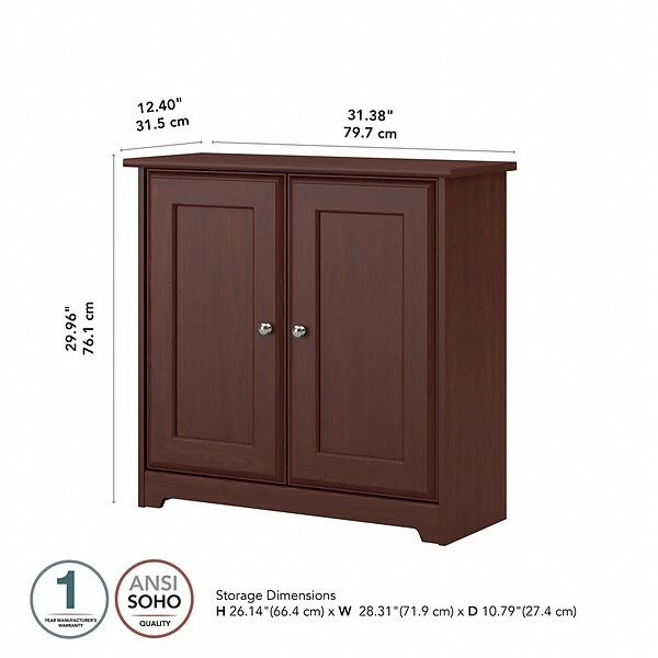 The Bush Furniture Cabot Small Storage Cabinet with Doors offers a convenient way to keep books, personal items and supplies organized in any home office or living space. Two cabinet doors with smooth Euro-style hinges open to reveal one fixed shelf and one adjustable shelf for the flexibility to store materials of various sizes. Each shelf supports up to 50 pounds, so organizing bulkier items like hardcover books, binders and photo albums is no problem. The small accent cabinet works well as a standalone storage solution or as part of a larger home office furniture set, and its height matches that of coordinating Cabot Desks (sold separately) to provide an extended work surface when placed side by side. This 2 Door Storage Cabinet is tested to meet ANSI/SOHO standards for safety and performance and is backed by a 1 Year Warranty. See the full collection for coordinating items available.