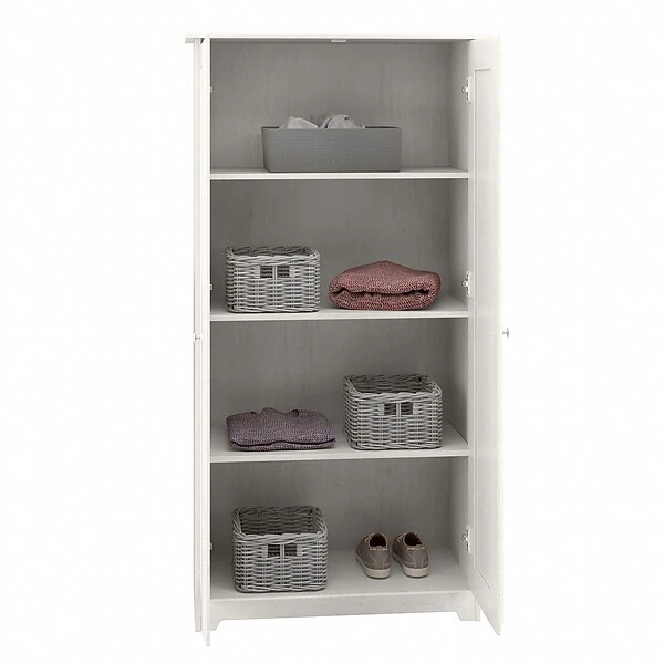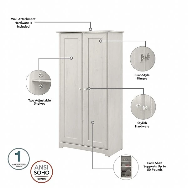 The Bush Furniture Cabot tall storage cabinet with doors offers a convenient way to keep books, personal items, and supplies organized in any home office or living space. Two cabinet doors with smooth Euro-style hinges open to reveal two fixed shelves and two adjustable shelves for the flexibility to store materials of various sizes. Each shelf supports up to 50 lbs., so organizing bulky items like hardcover books, binders, and photo albums is no problem. The tall accent cabinet works well as a stand-alone storage solution or as part of a larger home office furniture set, and it comes with wall attachment hardware for family-friendly safety and security in any environment. This two-door storage cabinet is tested to meet ANSI/SOHO standards for safety and performance and is backed by a 1-year manufacturer limited warranty.
