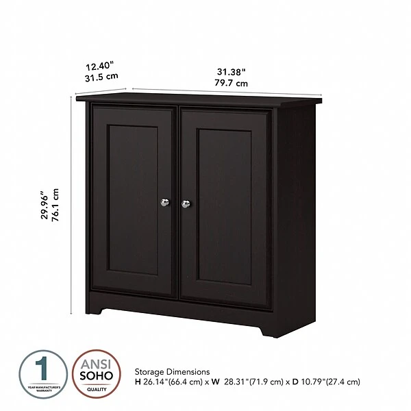 Outfit your office with the Bush Furniture Cabot Small Storage Cabinet with Doors for a stylish approach to concealed storage for books, personal items or supplies. Keep everything tidy and out of sight plus enjoy the adjustable shelf that helps to accommodate various sized items. This Low Storage Cabinet with Doors is designed to match your desk height to create an extended work surface, allowing you to spread out comfortably. You’ll enjoy its small footprint that enables room-placement flexibility. Enjoy this stylish and timeless design with rich finish and attractive Chrome hardware to complement any home or office environment. See the full collection for coordinating items. Backed by a 1 Year Warranty.