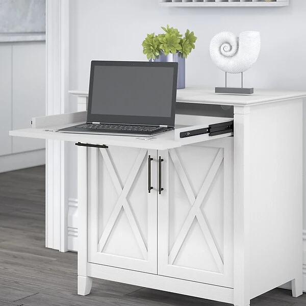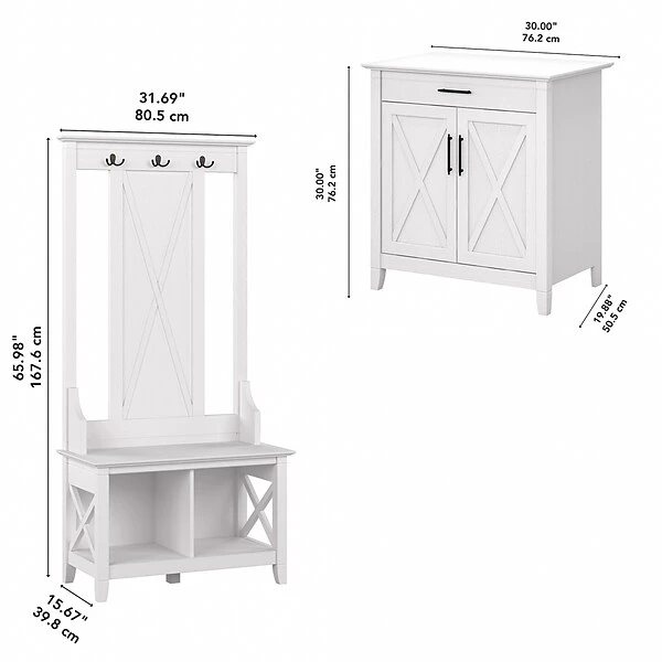 The Bush Furniture Key West hall tree with shoe storage bench and armoire cabinet offers an entryway solution that gives your home a touch of casual style. The hall tree includes three double-prong coat hooks for hanging jackets, hats, scarves, and more. The shoe bench supports up to 250 lbs., so you can take a seat while putting on or removing footwear. Stash your sneakers, boots, and other shoes under the storage bench to maintain a clutter-free mudroom. The armoire cabinet’s doors open to reveal one fixed shelf and one adjustable shelf to accommodate materials of various sizes. Its top drawer is perfect for organizing smaller accessories and clothing, while the surface can be used to display plants, pictures, and decorations. This entryway storage set has been rigorously tested to meet Bush Furniture standards for safety, durability, and performance and is backed by a 1-year warranty.