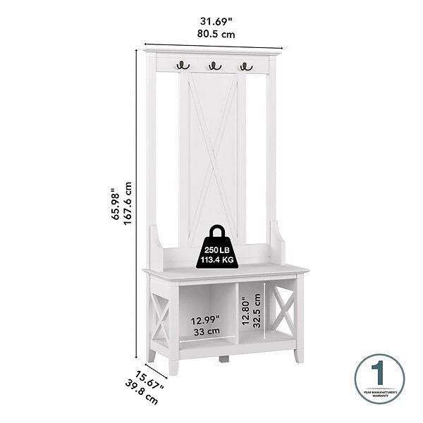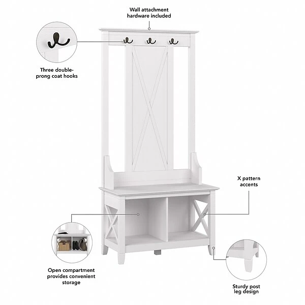 The Bush Furniture Key West hall tree with shoe storage bench offers an entryway solution that gives your home a touch of casual style. This entryway organizer has space for shoes, outerwear, and accessories, so they’re right where you need them when it’s time to go. The hall tree includes three double-prong coat hooks for hanging jackets, hats, scarves, and more. The shoe bench supports up to 250 lbs., so you can take a seat while putting on or removing footwear. Stash your sneakers, boots, and other shoes inside the open compartment underneath the storage bench to maintain a clutter-free mudroom. X-shaped accents convey a casual appearance that works well with cottage, coastal, and modern farmhouse style. This entryway bench and hall tree set has been rigorously tested to meet Bush Furniture standards for safety, durability, and performance and is backed by a 1-year warranty.