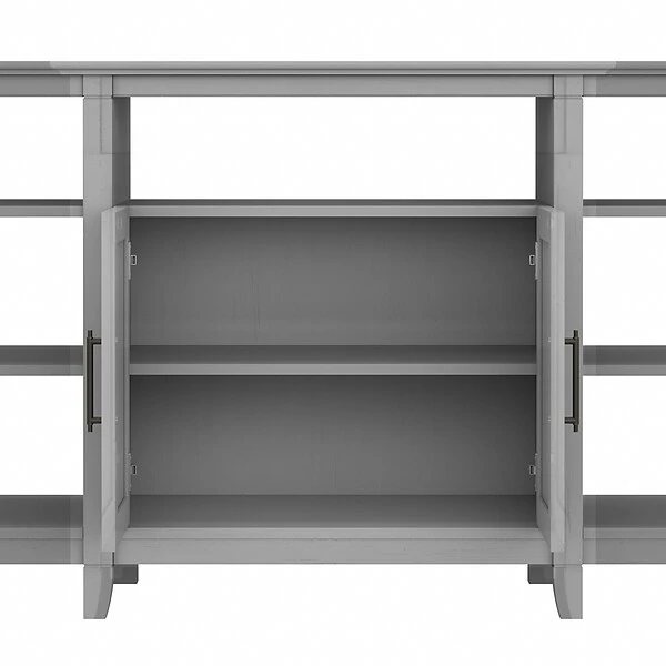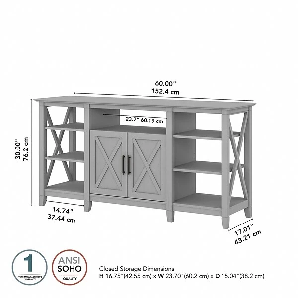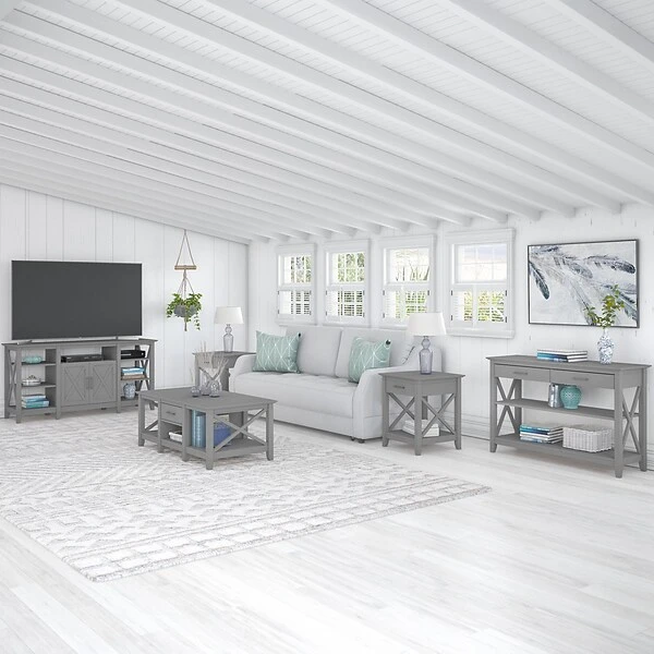 The Bush Furniture Key West tall TV stand with storage is a perfect way to bring the feel of a coastal retreat right to your living room. Highlighted by its X-pattern accents and Cape Cod gray finish, this entertainment center is a natural fit for homes that embrace farmhouse styling. Get together for movie night or catch up on your favorite show around a media stand that supports up to a 65″ TV and 75 lbs. A center cubby provides a great place to keep a DVD player or video game console while a cabinet with one adjustable shelf organizes movies and games. Open storage areas on the right and left each feature two fixed shelves and one adjustable shelf for additional media or decorations.