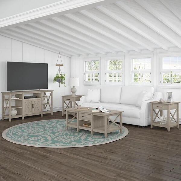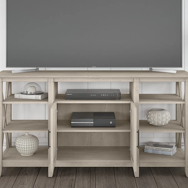 Featuring a relaxed modern farmhouse style, the Bush Furniture Key West tall TV stand for 65″ TV is a perfect choice for your casual living room. This TV stand is a perfect way to bring the feel of a coastal retreat right to your living room. Highlighted by its X pattern accents and a slightly weathered finish, this entertainment center is a natural fit in homes that embrace farmhouse styling. Get together for movie night or catch up on your favorite show around a media stand that supports up to a 65″ TV and has a weight capacity of 75 lbs.. A center cubby with cable management provides a perfect place to keep a DVD player or video game console while a cabinet with one adjustable shelf organizes movies and games. Open storage areas on the right and left each feature two fixed shelves and one adjustable shelf for additional media or decorations. This 60″ TV stand has been rigorously tested to meet Bush Furniture standards for safety, performance, and durability and is backed by a 1-year warranty.