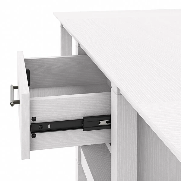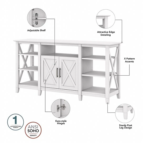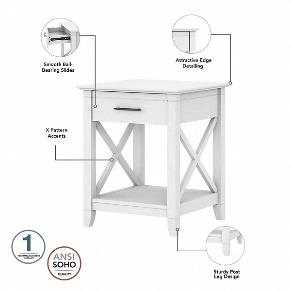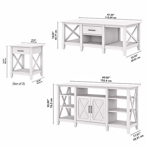 The Bush Furniture Key West tall TV stand with coffee table and set of two end tables is a perfect way to bring the feel of a coastal retreat right to your living room. Get together for movie night or catch up on your favorite show around an entertainment center that supports a 65″ TV or 75 lbs. An upper shelf with cable management provides a place for components, while the two-door cabinet and open storage areas organize movies, games, and more. The low coffee table has a box drawer and a cubby space in the center, and two open cubbies for books, magazines, and other household items on the sides. The side tables also include a drawer for small accessories like TV remotes and writing utensils, while the surface easily supports a lamp, plant, or pictures. This living room table set has been rigorously tested to meet Bush Furniture standards for safety, performance, and durability and is backed by a 1-year warranty.