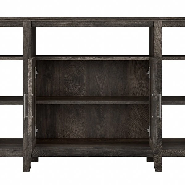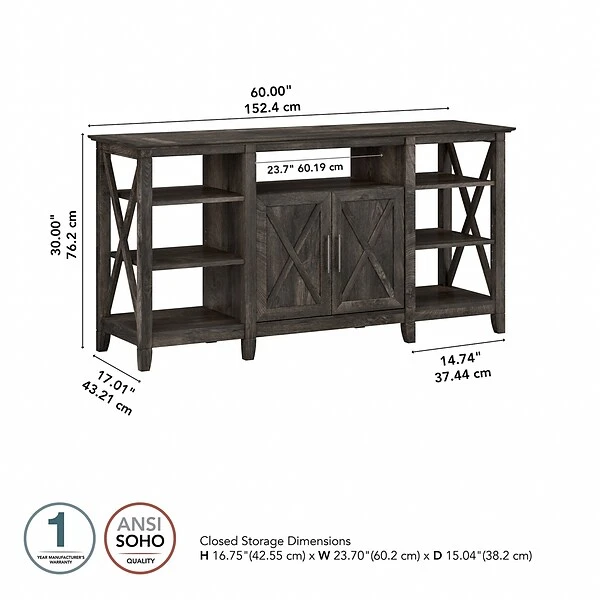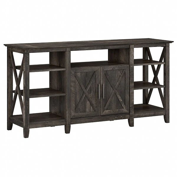 The Bush Furniture Key West tall TV stand with storage is a perfect way to bring the feel of a coastal retreat right to your living room. Highlighted by its X-pattern accents and dark gray hickory finish, this entertainment center is a natural fit for homes that embrace farmhouse styling. Get together for movie night, or catch up on your favorite show around a media stand that supports up to a 65″ TV and 75 lbs. A center cubby provides a great place to keep a DVD player or video game console while a cabinet with one adjustable shelf organizes movies and games. Open storage areas on the right and left each feature two fixed shelves and one adjustable shelf for additional media or decorations.