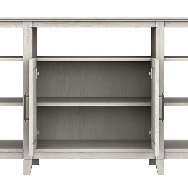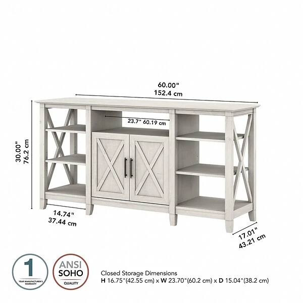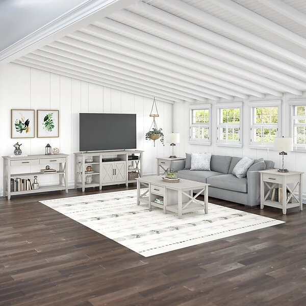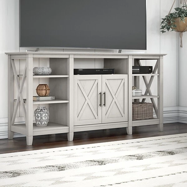 The Bush Furniture Key West tall TV stand with storage is a perfect way to bring the feel of a coastal retreat right to your living room. Highlighted by its X-pattern accents and your choice of casual finishes, this entertainment center is a natural fit in homes that embrace farmhouse styling. Get together for movie night or catch up on your favorite show around a media stand that supports up to a 65″ TV and 75 lbs. A center cubby with cable management provides a great place to keep a DVD player or video game console while a cabinet with one adjustable shelf organizes movies and games. Open storage areas on the right and left each feature two fixed shelves and one adjustable shelf for additional media or decorations.