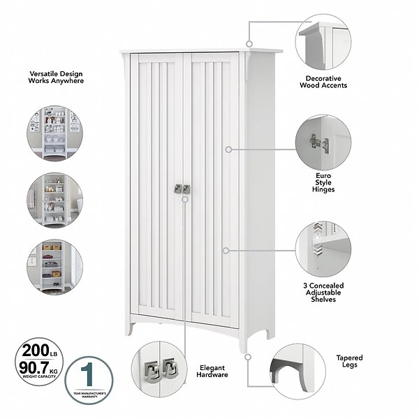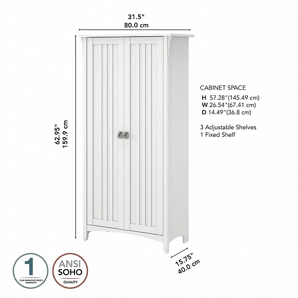 Organize your home with a storage cabinet that combines casual style with a convenient, versatile design. The Bush Furniture Salinas tall storage cabinet with doors features five concealed shelves for keeping household items, office supplies, and entertainment essentials in order and out of sight. Three adjustable shelves accommodate bulky items, such as binders and photo albums, while the two remaining shelves are fixed for stability. Each shelf supports up to 25 lbs., so you can confidently store larger materials. This floor cabinet makes a great addition to virtually any residential space.