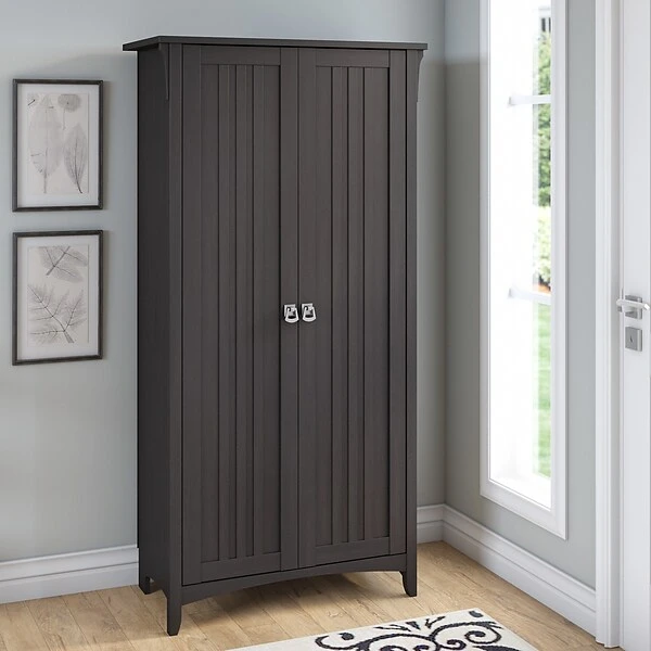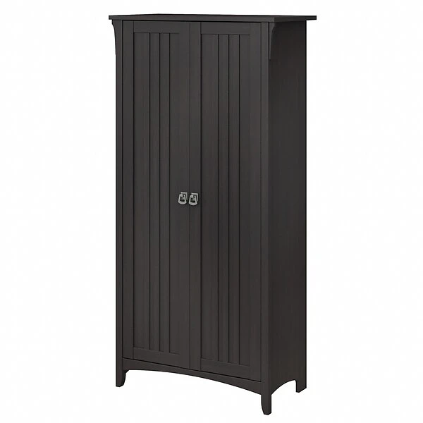 Organize your home with an accent cabinet that combines casual style with a convenient, versatile design. The Bush Furniture Salinas tall storage cabinet with doors features five concealed shelves for keeping miscellaneous household items, office supplies and entertainment essentials in order and out of sight. Three adjustable shelves can be moved up or down to accommodate bulky items like binders and photo albums while the two remaining shelves are fixed for stability.