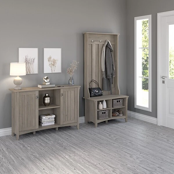 Use the Bush Furniture Salinas entryway storage set with hall tree, shoe bench, and accent cabinet to create a warm, welcoming environment right inside your front door. Have a seat on the 32″W x 16″D bench while putting on and taking off your shoes, or use the spacious surface to set bags down while you get comfortable. Four cubby spaces with two adjustable shelves provide plenty of room to organize footwear, keeping your mudroom free of unnecessary clutter. The hall tree attaches to the top of the shoe bench and adds three double prong hooks for hanging coats, scarves, and hats. The accent cabinet includes two doors for concealed storage as well as a central compartment that’s perfect for displaying your favorite decorations. Two adjustable shelves, one behind each door, accommodate items of various sizes. The entryway storage set is backed by a 1-year manufacturer warranty.