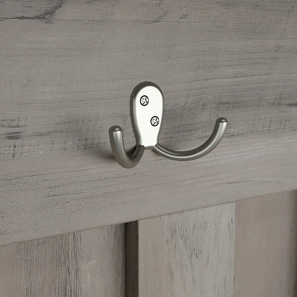 - Hall tree mounts to shoe bench and features three double prong hooks to hang coats, scarves, and hats