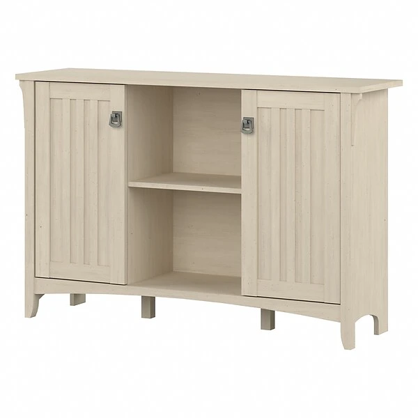 Complement the casual feel of your home with a Cabinet designed for your convenience and comfort. The Bush Furniture Salinas Storage Cabinet with Doors blends unique details and adjustable features for use in a variety of spaces. Complete your home office, hallway, bedroom or living room with a casual 2 door Cabinet featuring open and concealed storage. Place your favorite pictures, plants or a lamp on the spacious top while showing off additional knickknacks in the open cubby shelves below. Inspired by timeless Mission style, doors with vertical wood accents and elegant metal hardware conceal any items you don’t want out in the open. The white Cabinet contains 2 adjustable shelves, 1 behind each door. Tapered legs and curved base rails join the slightly distressed Antique White finish to provide a comfortable country feel. Backed by a 1 Year Warranty.