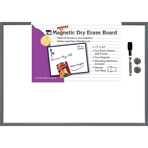 Magnetic dry erase board comes with a gray frame can easily match the decor in your home, dorm, classroom or office. Board measures 23″ wide by 17″ high, giving you a large writing area. Mounting hardware allows you to secure the board permanently and securely by using just the adhesive pads. Comes with a dry-erase marker with eraser and two magnets which allows our dry erase board to also double as a bulletin board for all your notes, pictures or anything else you might need. Marker is non-toxic and conforms to ASTM D4236.