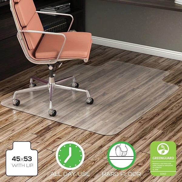 Go green in the office with this chairmat that’s made from renewable plant-based resources to provide a natural alternative to petroleum-based vinyl mats. Free and Clear formula offers exceptional clarity without any harsh chemicals. Easy-glide rolling surface allows you to move your chair freely when needed. Chairmat with a lip is designed for hard floor surfaces.