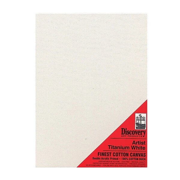 These pre-stretched, double acrylic primed canvases are made of 100% cotton duck. They possess a uniform, medium texture. The canvases are acid-free, precision squared, and require no keys.The canvases are for use with oils, acrylics, and water-based paints. They are available with titanium white or light gray priming.Discovery Stretched Cotton Canvases are stapled on the sides and are 3/4 in. deep. Canvas sizes 24 in. x 36 in. and larger have a cross stretcher bar for additional support.