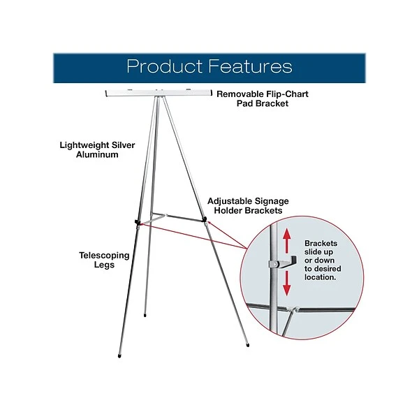 - Includes adjustable brackets to hold whiteboards and signage, and also has a removable top clip for paper pads or canvases