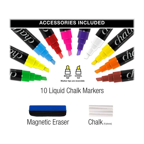 - Includes ten liquid chalk markers, a magnetic eraser, and four chalk pieces