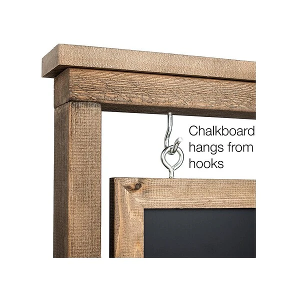 - Handcrafted wooden frame with sturdy base and chalkboard sign which hangs from the hooks