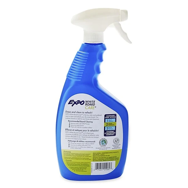 Spray a dry-erase surface with this specially formulated dry-erase cleaner to get rid of marks. This cleaner is non-toxic and safe for use in classrooms, homes or offices. This liquid Expo dry-erase cleaner has a 22-ounce capacity for erasing shadow marks, grease and dirt from whiteboards to keep notes legible.