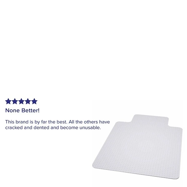 Chair mats are an essential component when furnishing your work or home office. Purchasing a chair mat is a worthwhile investment for assurance that your floors will be protected and are ergonomically beneficial in preventing leg fatigue. Not only do they protect your floors, chair mats offer personal safety with ease of mobility and provide a clean appearance. Our Big and Tall chair mats are an invaluable choice for multi-shift work locations and are rated to hold up to 400 pounds. This carpet chairmat features a scuff and slip resistant textured top and small studded anchors on back to properly grip carpet. This mat includes a protruding lip to protect the floor under the desk when the chair is rolled all the way under the desk.