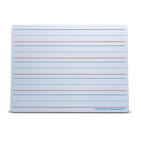 Two-Sided, Red & Blue Ruled Dry Erase Learning Mats are great for teaching and practicing fundamentals at the early learner stage. The bright white sheets contain 5 sets of blue headlines and broken mid-lines plus, a red baseline format. Each line set measures 1 1/8″ with 3/8″ of blank descender space between sets. The back side is plain white, dry erase with a blue border. The mats feature a high-quality, non-ghosting write-and-wipe surface with smooth, rounded edges and corners. The learning mats measure 9″ x 12″. Each pack includes 12 individual mats.