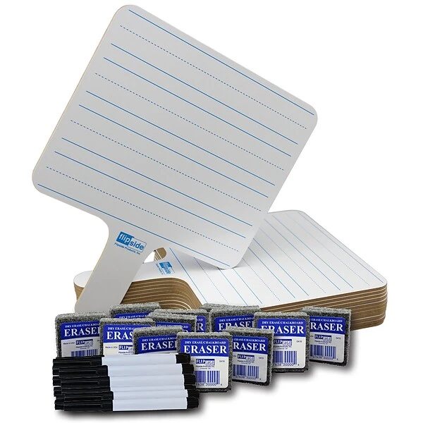 The two-sided rectangular dry erase writing paddles are ideal for quick responses or lessons. One side features 4 lines for handwriting practice, reverse side features a blank dry erase side. Each class pack includes 12, includes 12 paddles, 12 erasers, and 12 dry erase pens. Each paddle measures 7.75″ x 10″ and 1/8″ thick.