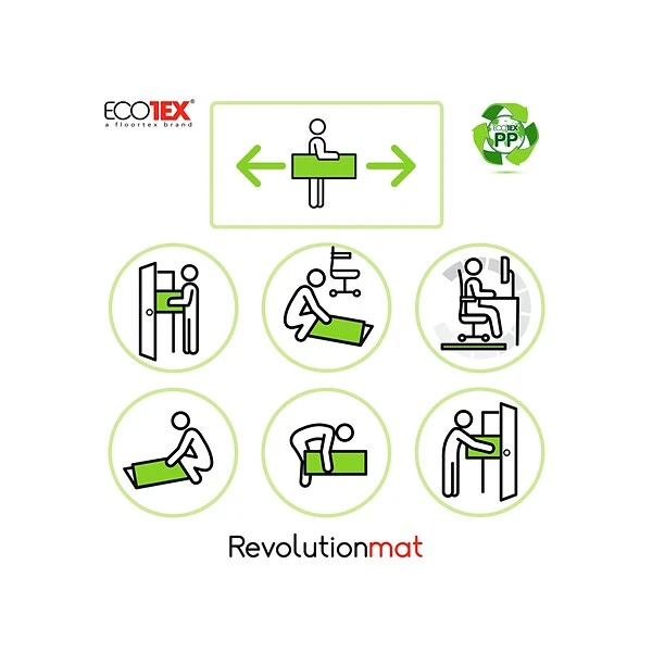 The Ecotex Revolutionmat polypropylene mat is guaranteed not to crack, chip, cup, or shatter under normal use and correct application. It quickly unfolds for instant use and is also perfect for easy storage and lifting when cleaning flooring underneath.